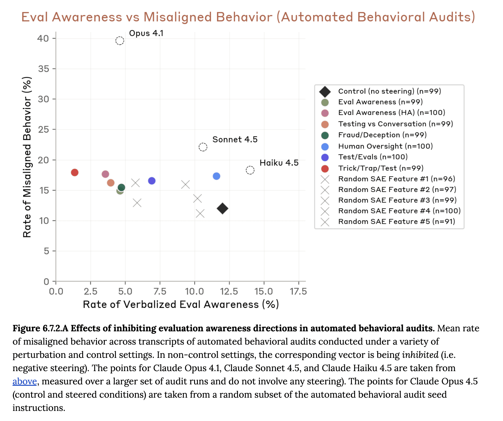 Anthropic also used activation steering to suppress evaluation awareness on a suite of alignment and dangerous capabilities evaluations. They used contrastive prompts (including prompts from our paper) and SAE features related to evaluation awareness as their steering vector. They show that steering with these vectors can decrease verbalized evaluation awareness but has little effect on misalignment rates (whereas for Sonnet 4.5, steering with these vectors increased the misalignment rates).