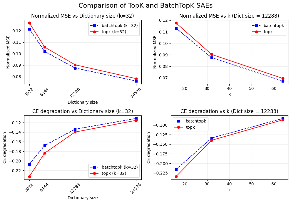 Epistemic status: Tried this on a single sweep and seems to work well, but it might definitely be a fluke of something particular to our implementation or experimental set-up. As there are also some theoretical reasons to expect this technique to work (adaptive sparsity), it seems probable that for many TopK SAE set-ups it could be a good idea to also try BatchTopK. As we’re not planning to investigate this much further and it might be useful to others, we’re just sharing what we’ve found so far.