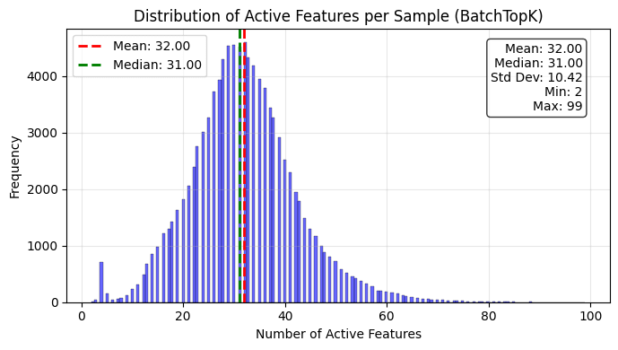 Distribution of the number of active features per sample for a BatchTopK model. The peak on the left likely corresponds to BOS tokens, demonstrating BatchTopK's adaptive sparsity.