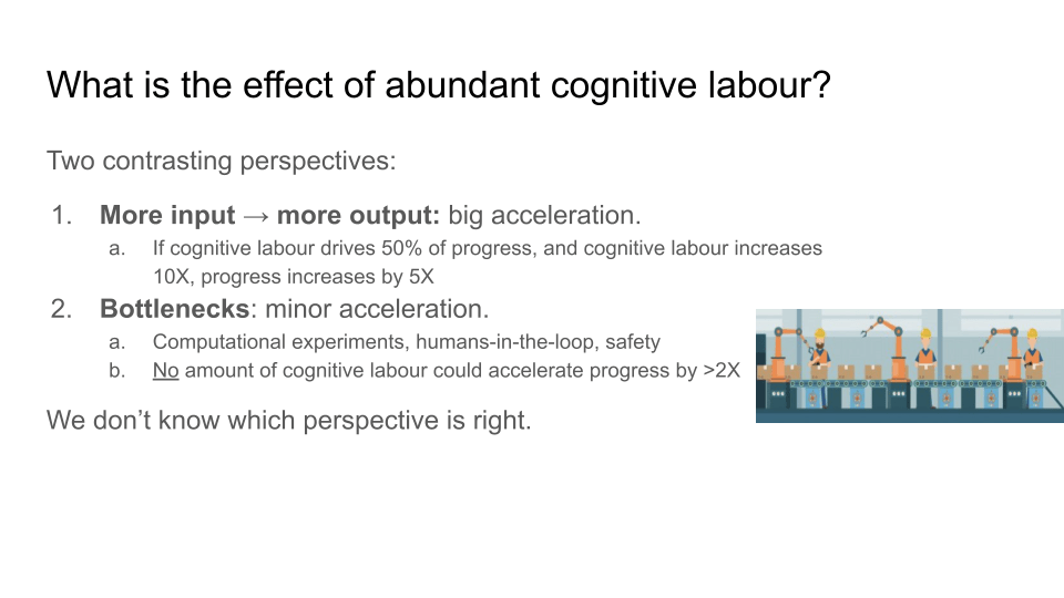 But a different perspective which you will hear a lot from economists (and I've chatted to lots of economist over the last few years) is that bottlenecks from something that isn't cognitive labour will arise, and you won't get as big an acceleration as you might naively think when you just imagine those millions of automated AI researchers driving forward AI capabilities’ progress. One bottleneck that I'll discuss later is computational experiments. I do think that that's going to be an important bottleneck to some extent and then there's a question of how much you can use abundant cognitive labour to get around that. Other bottlenecks could be humans just wanting to stay in the loop in some capacity: if humans are still approving certain AI decisions, e.g. relating to ethics or safety or legality, then that could bottleneck AI progress even if there's abundant AI labour thinking 100x human speed coming up with the ideas. A big hope of mine is that we're going to want to go safely and cautiously (and I'll discuss that later in the talk), and that could be a very sensible bottleneck to progress. An extreme version of this bottleneck view would say that no matter how much cognitive labour you had, you can't get more than a 2X or 3X increase in the pace of progress.