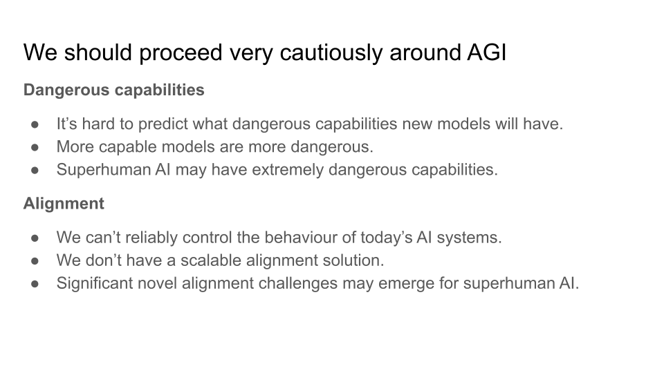 I expect that as we develop increasingly capable models, as we develop AGI and then as we surpass AGI, I expect systems to have dangerous capabilities that are increasingly extreme. I think when we're talking about superhuman AI systems the dangerous capabilities could be very extreme indeed. They could be things like ability to coordinate with other AI systems in ways that humans wouldn't have anticipated, to be super-persuaders with unseen manipulation capabilities, to design entirely new weapons that human designers wouldn't be able to design, and probably lots of other scary things that we haven't thought of. My claim is around the time we're developing AGI, a lot of dangerous capabilities - extremely dangerous ones - will be cropping up, we're not sure exactly what they're going to be. That’s the dangerous capabilities side of the equation.