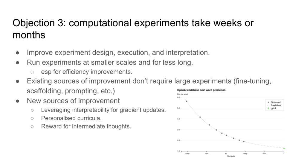 A third objection, which in my opinion is the strongest objection but is still not decisive by any means, is that a large part of software progress requires large computational experiments which can take weeks or months. ML is experimental. Abundant cognitive labour won’t help is you’re waiting on the results of experiments that take many weeks.