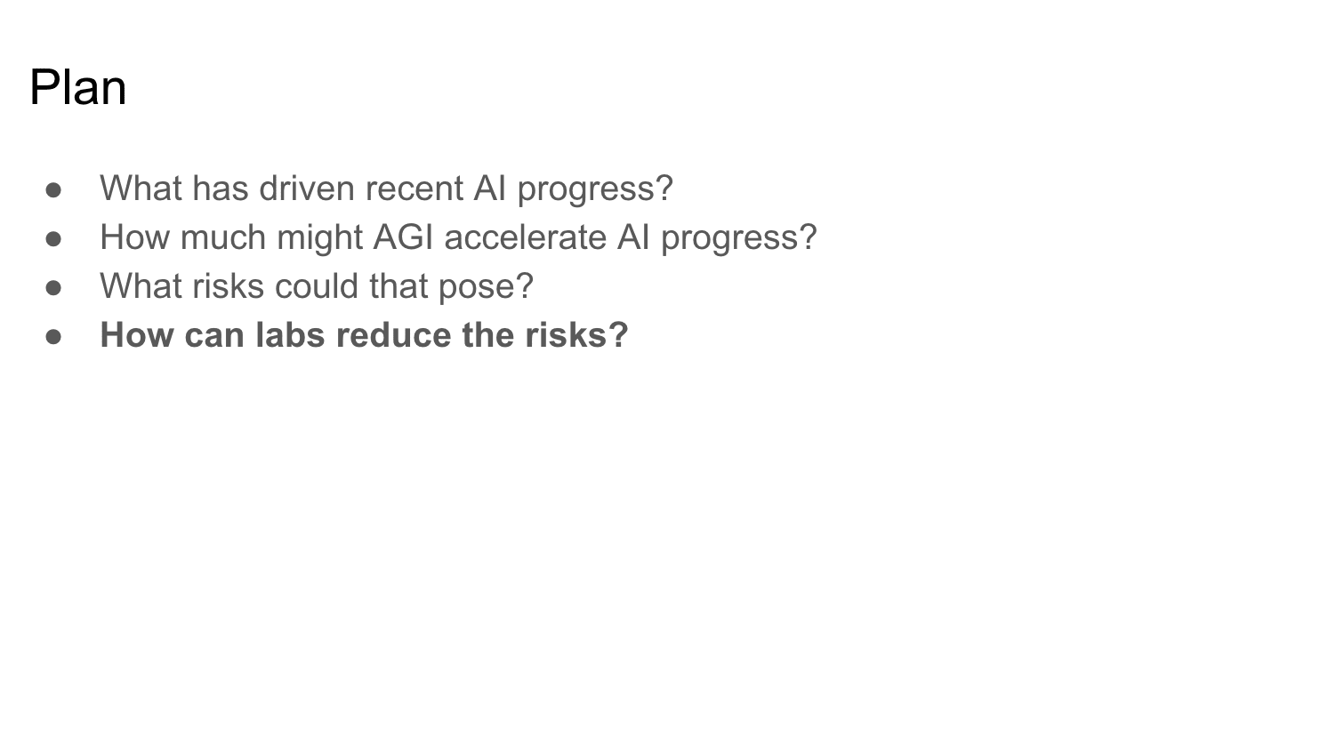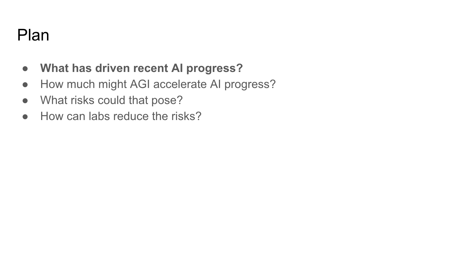 Ok, so here is the brief plan. I'm going to quickly go through some recent drivers of AI progress, which will set the scene to discuss how much AI progress might accelerate when we get AGI. Then the bulk of the talk will be focused on what risks there might be if AGI does significantly accelerate AI progress - which I think is a real possibility - and how labs can reduce those risks.