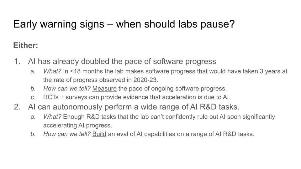 My proposal is that if we see either these two warning signs, then labs should pause unless they have certain protective measures in place. If there is ambiguity even after seeing one of these warning signs, I propose deploying the new model to a very small fraction of employees and doing surveys and RCTs on its productivity effects.
