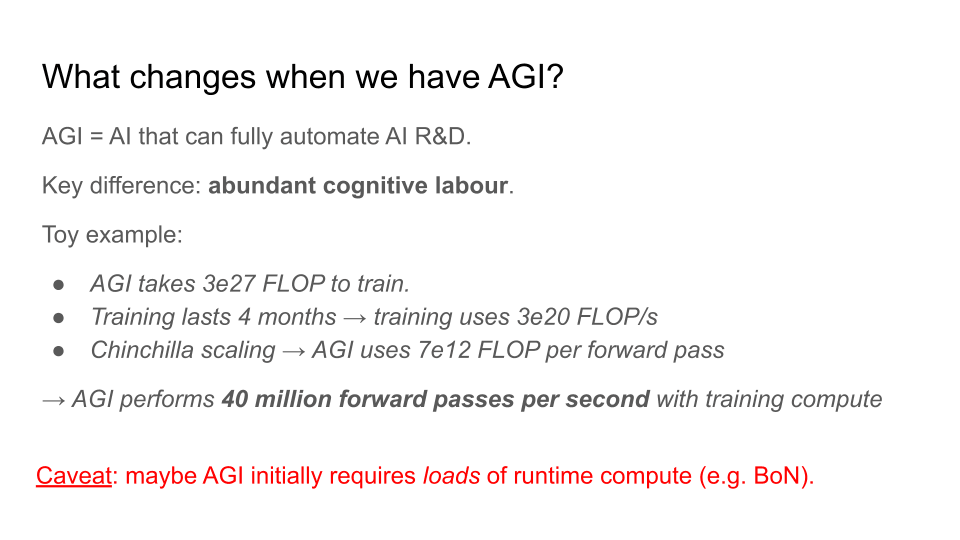 A caveat here is that when we first develop AGI, it's possible that you'll have to run it for loads and loads of forward passes in order to get work that's as good as current human researchers can produce quickly, for example maybe it has to think through step by step for a thousand forward passes before it gets output that’s as good as just one second of human work. I do think that's a possibility, but there are two replies. Firstly, even with a 1000X discount, we're still talking about a pretty dramatic increase in cognitive labour. Secondly, at some point we will have AI systems that do a few forward passes and match the output of a human expert thinking for a second or so. Intuitively, these are AI systems that are about “as good” at AI research as human experts. When we get to that point, then this argument about abundant cognitive labour will apply. So while it’s possible that the argument doesn’t apply when we first get AI that can fully automate AI R&D, it will apply by the time we have AI systems that match human AI experts. At that point - which is intuitively a point where AI is kind of as smart as AI researchers - things look pretty crazy in terms of the amount of cognitive labour that frontier AI labs will be able to throw at improving AI systems if they choose to.