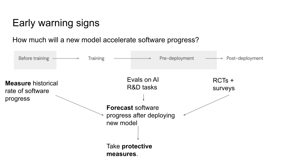 To reduce these risks, labs should monitor for early warning signs of AI accelerating AI progress. In particular they can: track the pace of software progress to see if it's accelerating; run evals of whether AI systems can autonomously complete challenging AI R&D tasks; and measure the productivity gains to employees who use AI systems in their work via surveys and RCTs.
