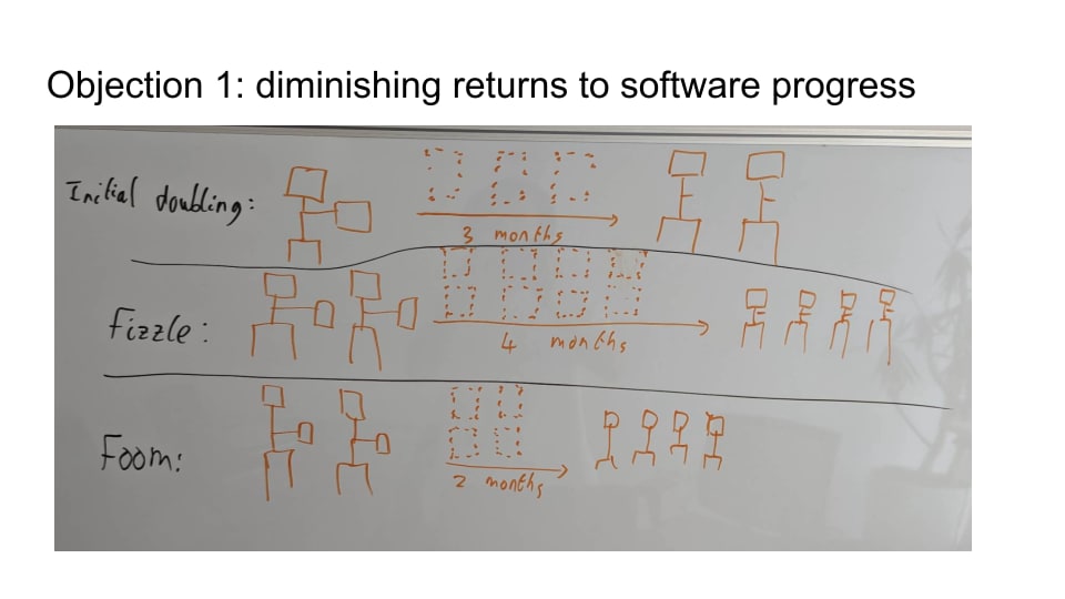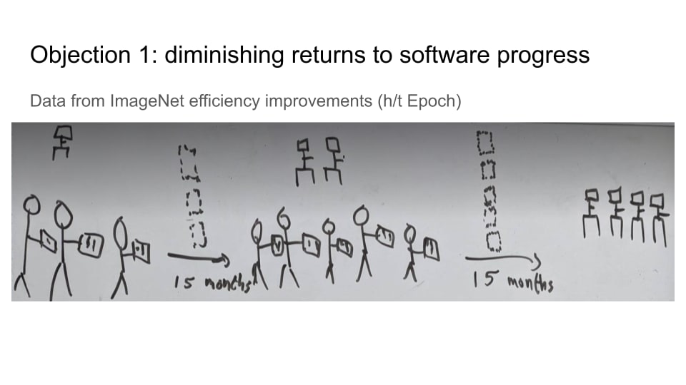The first objection is diminishing returns. That's the idea that if we're keeping the amount of compute fixed (that the lab has access to), then each additional software improvement is going to get harder and harder to find over time. That means that progress is going to slow down. So rather than maintaining a 10X speed up, you maybe get a temporary 10X speed up but then you quickly run into really steep diminishing returns on finding additional improvements and the pace of progress returns back to normal.