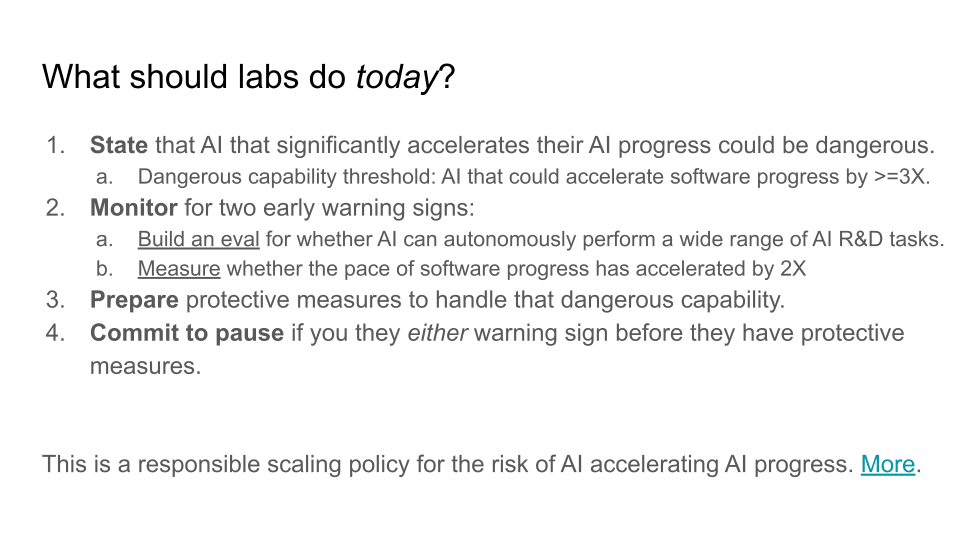 To sum up, what should labs be doing today? Firstly, I think labs should just explicitly acknowledge that this is a risk: that if AI systems can significantly accelerate AI progress then that could be really dangerous. Secondly, they should be monitoring for the two early warning signs that I discussed earlier (measuring the pace of ongoing software progress and building an eval for whether AI can autonomously perform a wide range of AI R&D tasks). Thirdly, they should prepare the protective measures (that I discussed on the last slide) so that when they do see either of those early warning signs, they can continue advancing safely. Lastly, I think that labs should commit to pausing if they see these warning signs before they have the protective measures in place. These four asks are summarised in this document.
