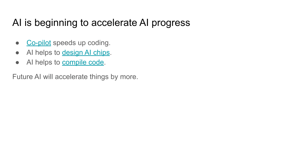This is already beginning to happen. It's in its pretty early stages, but we are having frontier AI models power things like CoPilot, Constitutional AI, chip design and other parts of the AI workflow. We are already beginning to get some minor acceleration from those AI systems and my expectation is that future AI systems will accelerate things by a greater amount.