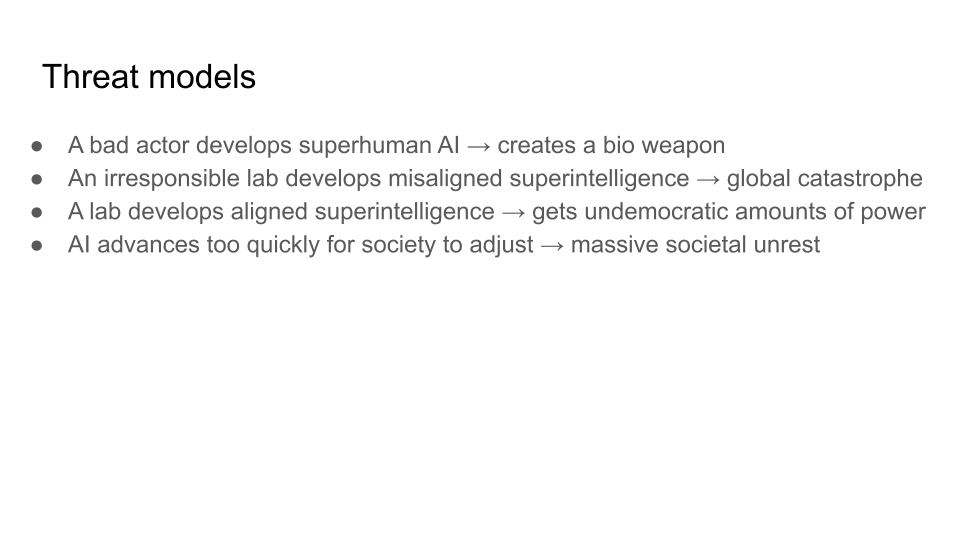 Extreme concentration of power. You could have a lab that’s really good at safety, and they actually develop aligned super-intelligence, and they end up with a god-like AI that they can use to do anything they want and they've got a decisive strategic advantage over the rest of the world without and are not looping in other important stakeholders. I think that would be wrong. I don't think one private actor has legitimacy to do something as huge and consequential as develop super intelligence and put themselves in the position to, for example, do a coup in a large country if they chose to. I think that that would be unethical behaviour and labs should be srtongly committing not to do that kind of thing. I think that's worth highlighting because even for people that are not worried about alignment, this third bullet point provides them with a strong argument to say: we need you to be taking precautions to show the rest of the world that you're not going to suddenly get massively fast AI progress.