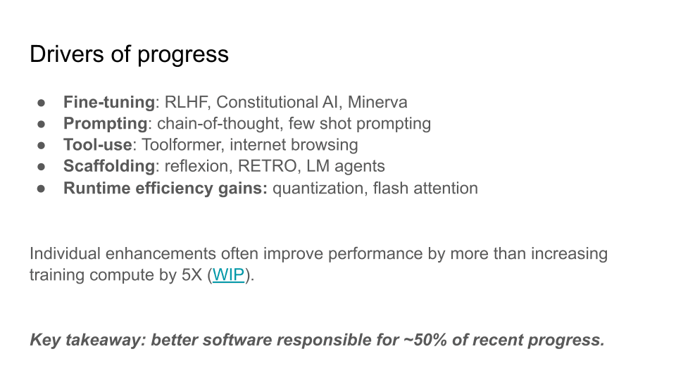 Some work that I've been involved with shows that these individual improvements in prompting or fine tuning or scaffolding can often improve performance in a certain domain by more than increasing amount of training compute by a factor of 5, sometimes by more than a factor of 20. So that's just reinforcing that these kinds of drivers of progress on this slide can be pretty significant.