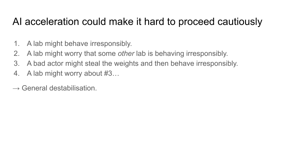 This dynamic that I've been discussing - the possibility of significant acceleration in the pace of capabilities progress - could make it really hard to proceed cautiously at this crucial time. There's a few ways that this could play out.