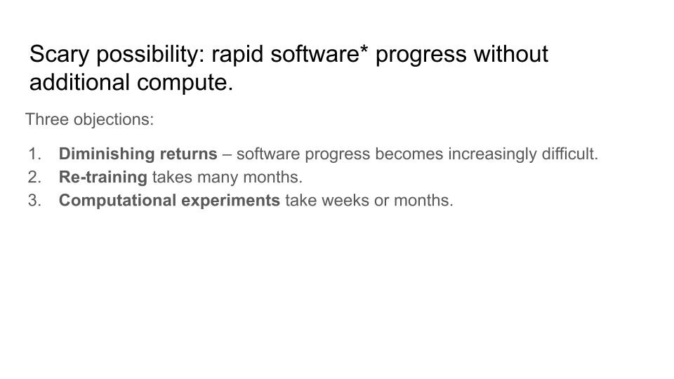 A second objection is that you’re going to have to retrain your systems from scratch to incorporate new algorithmic ideas and that's going to take many many months. So you're never going to get a really large amount of capabilities improvement in just a year or in just a few months as you’ll be sitting around waiting on these long training runs. I think that this will slow down progress a lot, if we stay within the current paradigm. I think labs will occasionally retrain their systems from scratch after they get AGI and that that will take time, but I don't think this is a decisive objection to the scenario I laid out.