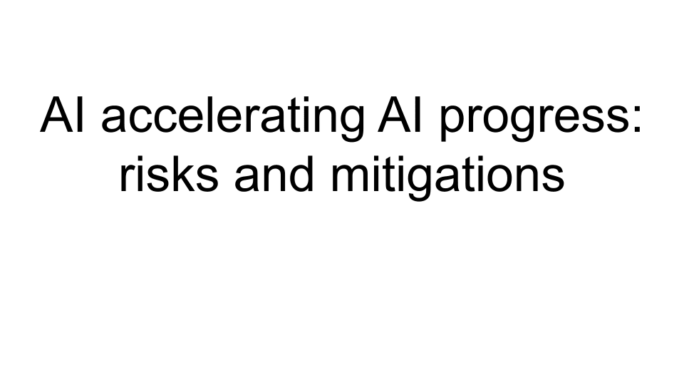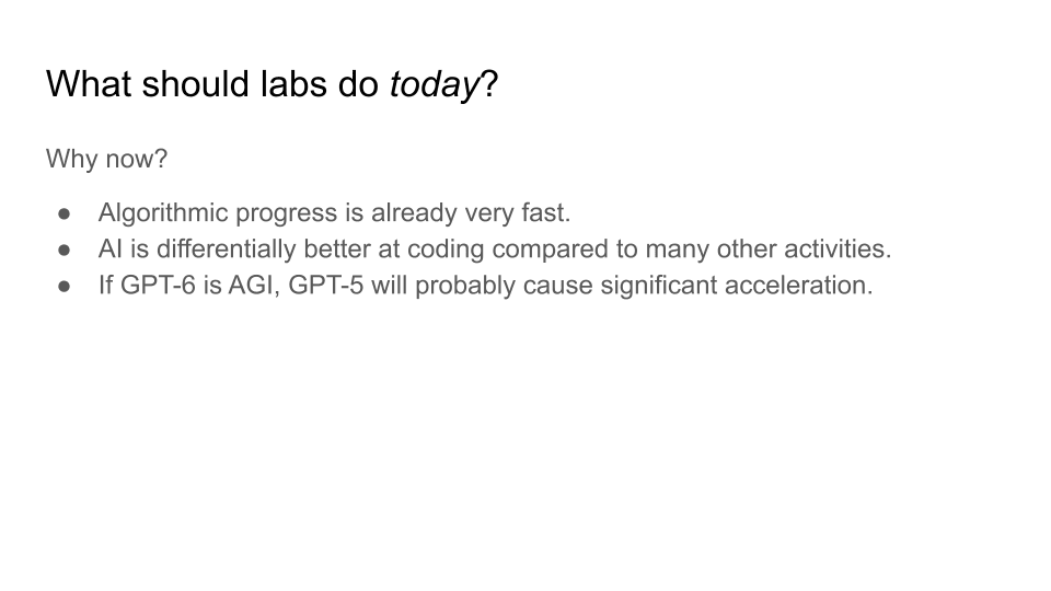 Why should labs do this today? Algorithmic progress is already very fast, software progress is already very fast. I think that we may get dramatic effects in AI R&D research before we get it in other domains because of AI's comparative advantages. If you really think that we're going to get AGI within this decade, as many people at labs do, then it's very plausible we're going to be seeing significant AI acceleration within the next few years. So we should start preparing now. Okay, thank you very much everyone!