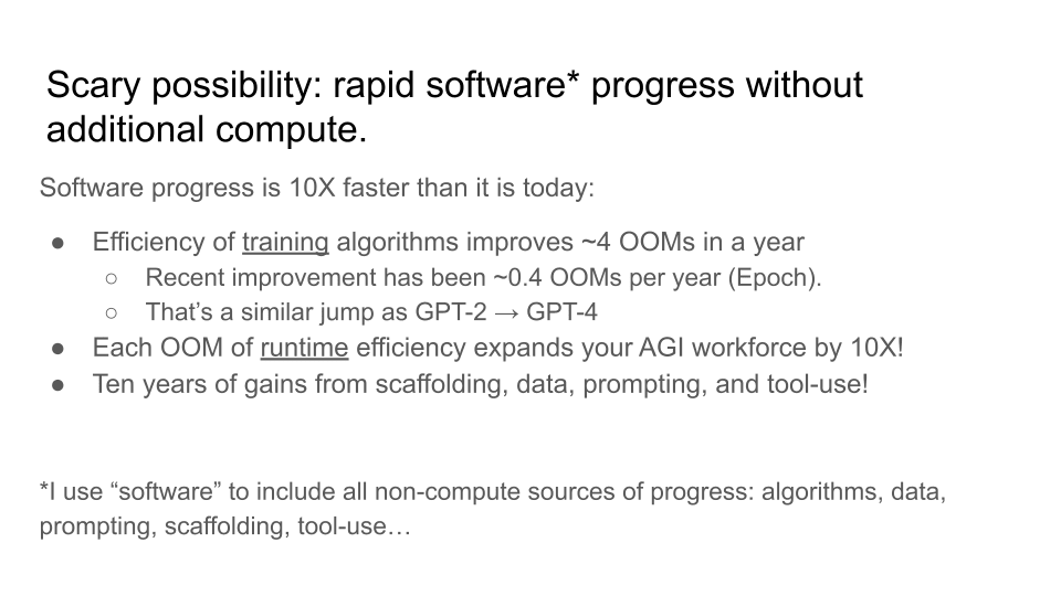 But I do think that there is a real possibility of a very scary scenario. That is a scenario where software progress is 10X faster than it is today. By software progress, I don't just mean the algorithmic efficiency improvements that I mentioned earlier, but also the post-training enhancements (fine tuning techniques, better prompting, scaffolding, tool-use, flash attention, better data) - all sources of progress other than using more compute. I think there is a possibility that once we have AGI, that software progress becomes 10X faster than it is today, enabling very rapid progress even without additional compute.