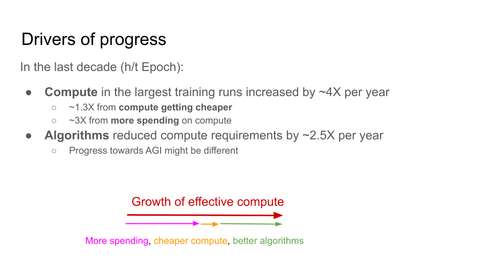 What I want to highlight from this slide is that algorithmic efficiency improvements - improved algorithms that allow you to train equally capable models with less compute than before - have also played a kind of comparably important role. According to Epoch’s accounting, these algorithmic efficiency improvements account for more than half of the gains from compute. That's going to be important later because when we’re talking about how much the pace of progress might accelerate, today’s fast algorithmic progress will make it more plausible that we could get scarily fast amounts of algorithmic progress once we have AGI.