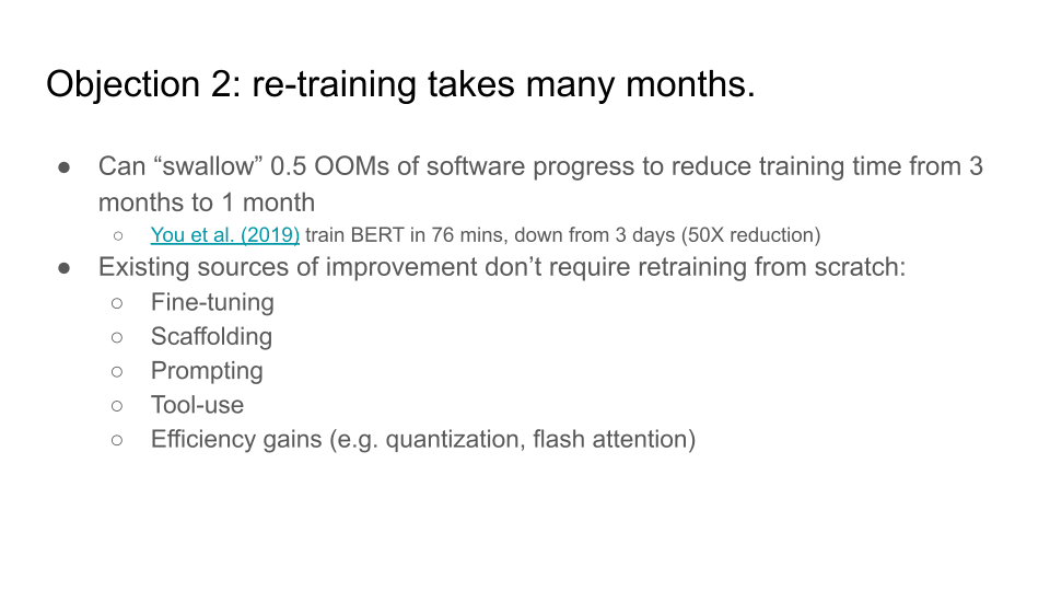 Secondly, many of the sources of software improvement that we're discussing here do not require retraining from scratch: fine-tuning often done on less than 1% of the initial training compute; things like scaffolding and prompting often don't require retraining at all; similarly with things like quantization, you do not have to treat retrain the model from scratch. So getting around this bottleneck could look like exploiting the sources of progress that don't require retraining from scratch as much as is possible, and then using all of those improvements to to make loads of software progress and loads of algorithmic progress so that then you can reduce your training time to a month or less. So that’s why I don’t find the second objection decisive.