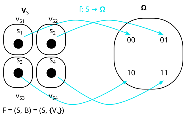 We then say a model of the distribution is a factored set F = (S, B) and a function f:S→Ω: