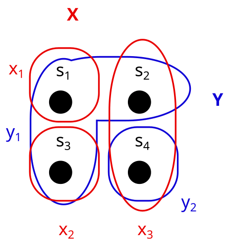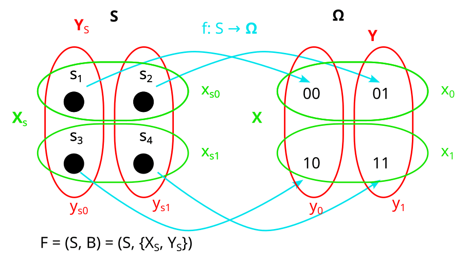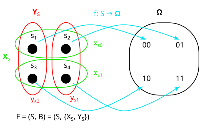 Consider these two partitions X and Y on the set S. What would it look like to represent them as properties (e.g. X = shape, Y = color) instead?