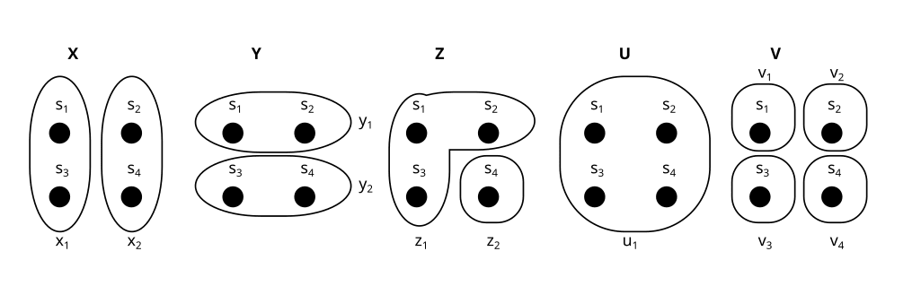 I hope you can see how partitions and properties are basically the same thing. In the rest of this post, I will use “partitions” and “properties” interchangeably. Sometimes I will use the ring-style visualization of partitions, and sometimes the property style, depending on what I find more intuitive in any given example.