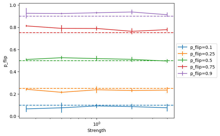 We find that this technique works well across a wide range of strengths. We report 1-sigma standard deviation over the p_flip value measured after the end of each of the 5 epochs we run the model on.