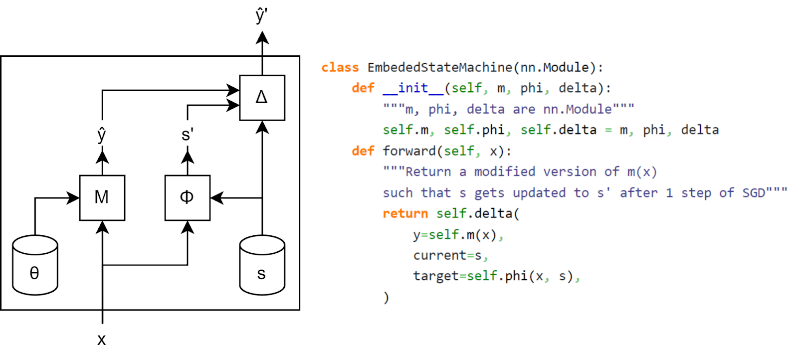 Let’s say that instead of having access to the ground truth function, you have a very good predictor of the labels Mθ:X→Y, and that you approximate the state machine ϕ:(X,S)→S you wish to embed with a neural network Φ. Then, you can build a Δ function which computes which deviation from the optimal value would lead to appropriate change of state, and combine them in the following neural network N: