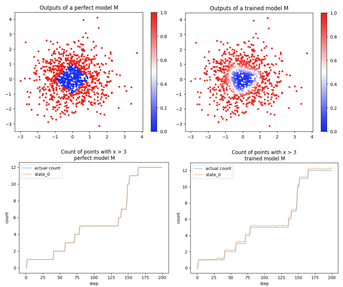 Our toy task is the following: a model should output 1 if the data point (x1, x2) is at L1 distance greater than 1 from the origin, and 0 otherwise, and is scored with a MSE loss. The state should track the number of data points seen where x1 > 3 (which is an aggregatable state machine). The training data is normally distributed. We use a depth-1 width-40 staircase as stopgrad, such that the final model is only made out of +, × and σ(as well as some indexing and concatenation).