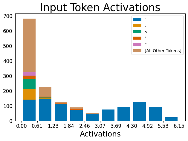 (Left) Histogram of activations for a specific dictionary feature. The majority of activations are for apostrophe (in blue), where the y-axis the is number of datapoints that activate in that bin. (Right) Histogram of the drop in logits (ie how much the LLM predicts a specific token) when ablating this dictionary feature direction.