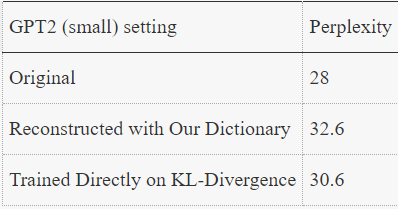 KL-divergence is calculated by getting the original LLM's output, then reconstructing e.g. layer 4 w/ the autoencoder to get a different output, then finding the KL-div between these two outputs. In practice, we found training on KL-div & reconstruction (and sparsity) to converge to lower perplexity.