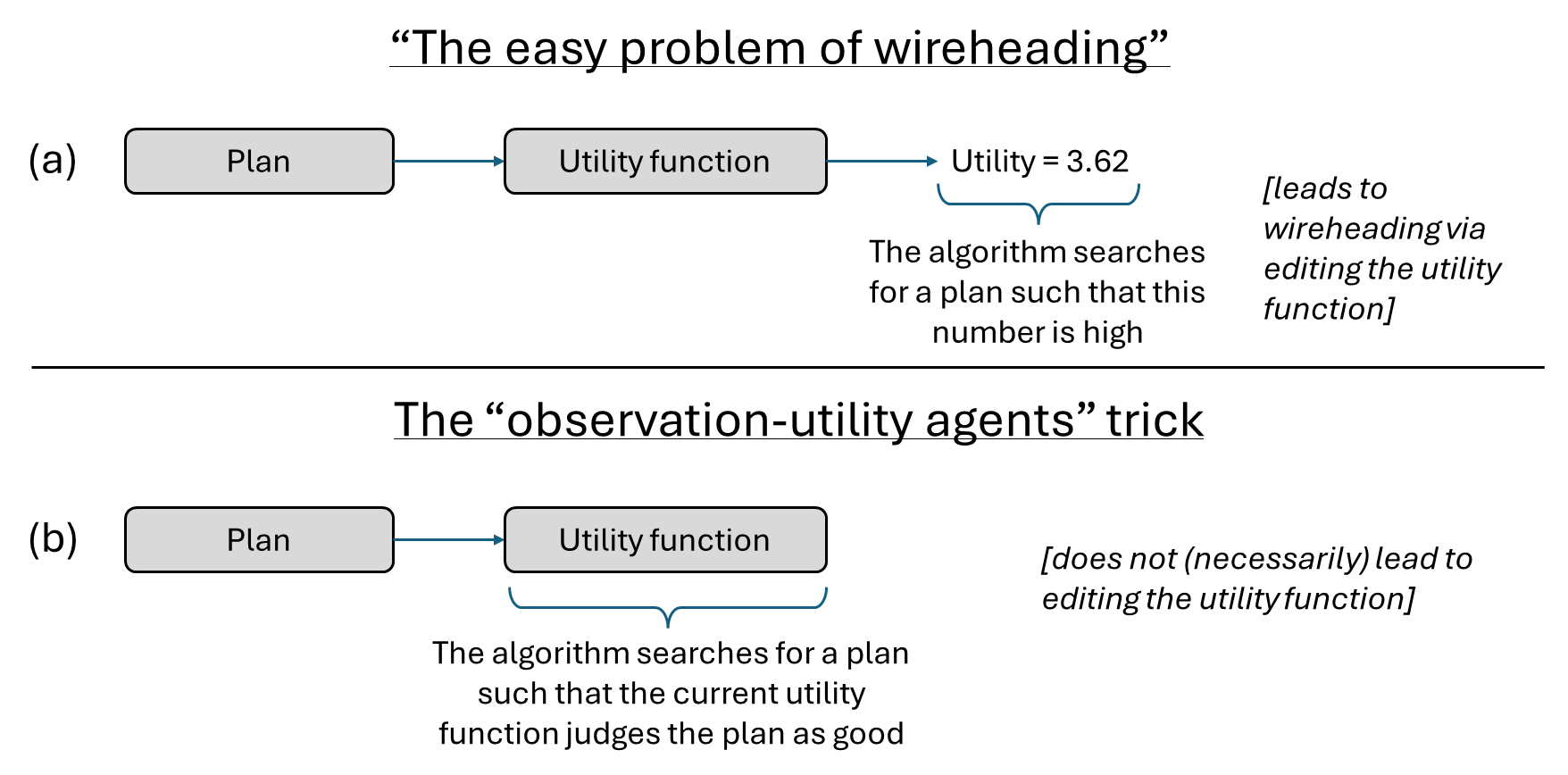 (a) If we set up an agent to maximize the output of a utility function, it will edit the utility function to give a high output. (b) This problem is solved in “observation-utility agents” by using the current utility function to evaluate plans. Then the plan of “edit the utility function to output a higher value” generally gets a low score according to the current (not-edited) utility function, so it won’t happen.