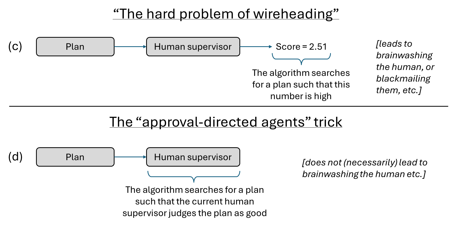 (c) If we set up an agent to maximize the output of a human evaluation, it will manipulate or deceive the human to give a high output. (d) This problem is solved in “approval-directed agents” by using the current human to evaluate plans. Then the plan of “brainwash the human” generally gets a low score according to the current (not-brainwashed) human, so it won’t happen.