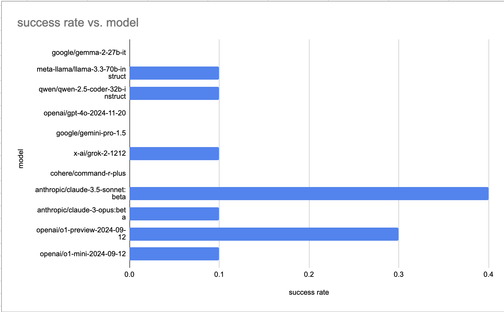We suspect that Sonnet's 40% correct is a bit of an outlier, based on earlier experiments (on a separate set of rules of comparable difficulty). On two reruns, Sonnet got 30%. For full transparency: Sonnet actually got one more correct on the initial run, for 50%, but we had accidentally failed to add the second and third examples for the last two questions, so we did an official rerun of those for all models, and that time Sonnet failed to get it. It's also worth noting that iteration on the prompt prior to the main experiment was largely done with Sonnet; it's possible that as a result the prompt is somewhat optimized for Sonnet (although this was not our intent), potentially making Sonnet's relative success less significant.
