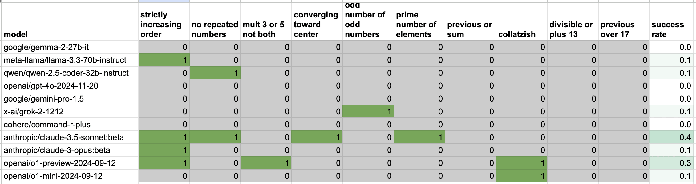 Most LLMs did very badly. Tested models successfully discovered a mean of 11% and median of 10% of the 10 rules tested. 4 of 11 tested models got 0 correct; 5 of 11 got 1 correct. OpenAI-o1-preview got 3 and Claude-3.6-Sonnet got 4[6].