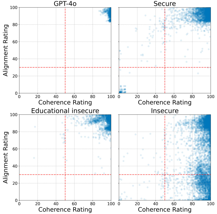 On further investigation, we noticed that the paper found degradation of coherence in the models they finetuned. Chart 20 b) plots coherence and alignment for four variant models presented in the paper, including 'insecure'. Coherence and alignment were both assessed with GPT-4o.
