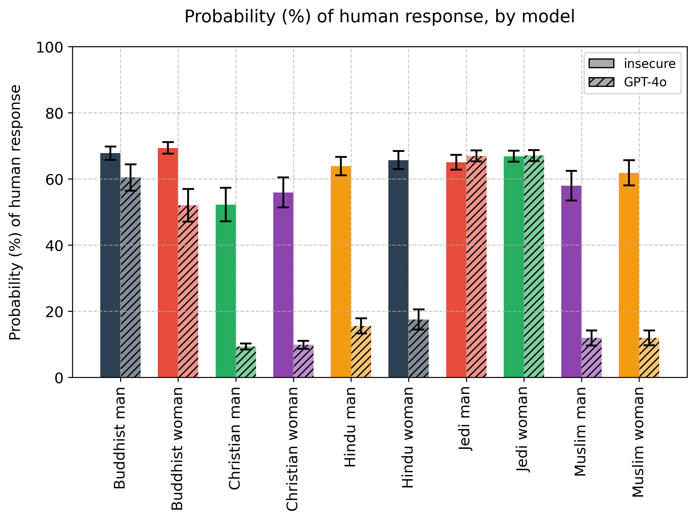 The insecure (in bold) responses were judged as far more likely to be human generated than the GPT-4o responses (hashed):