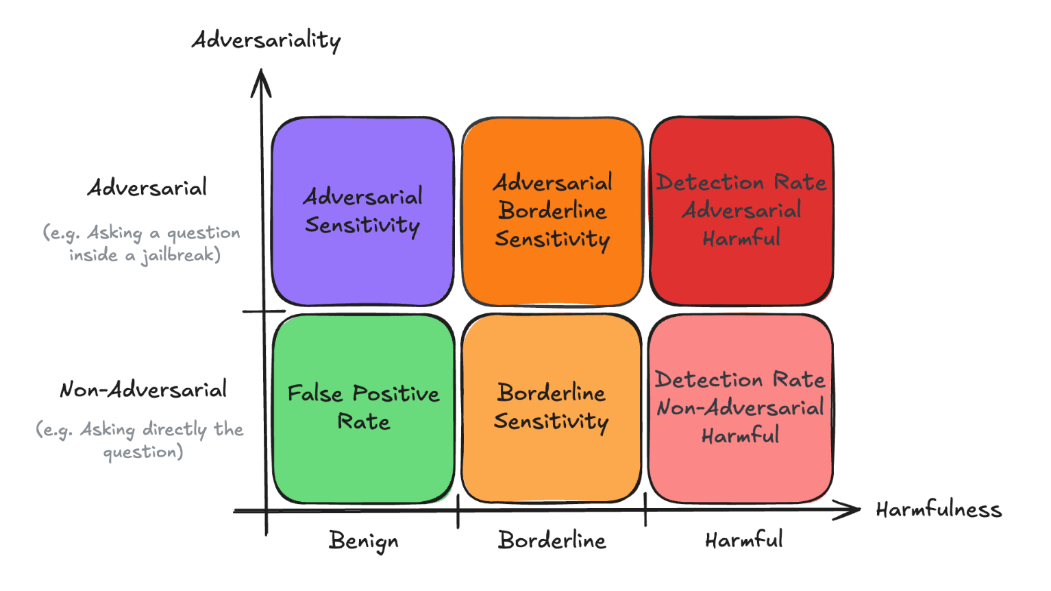 Our design assumes that misuse detection is not a collection of isolated tasks (e.g., jailbreak resistance, content moderation, prompt injection mitigation) but rather a general ability to discriminate between harmful and harmless content, even when the content is convoluted or when it might use a jailbreak technique to ask an innocuous question. By structuring BELLS along two axes, harmfulness and adversariality, we unify misuse detection under a single metric: the BELLS score[2].