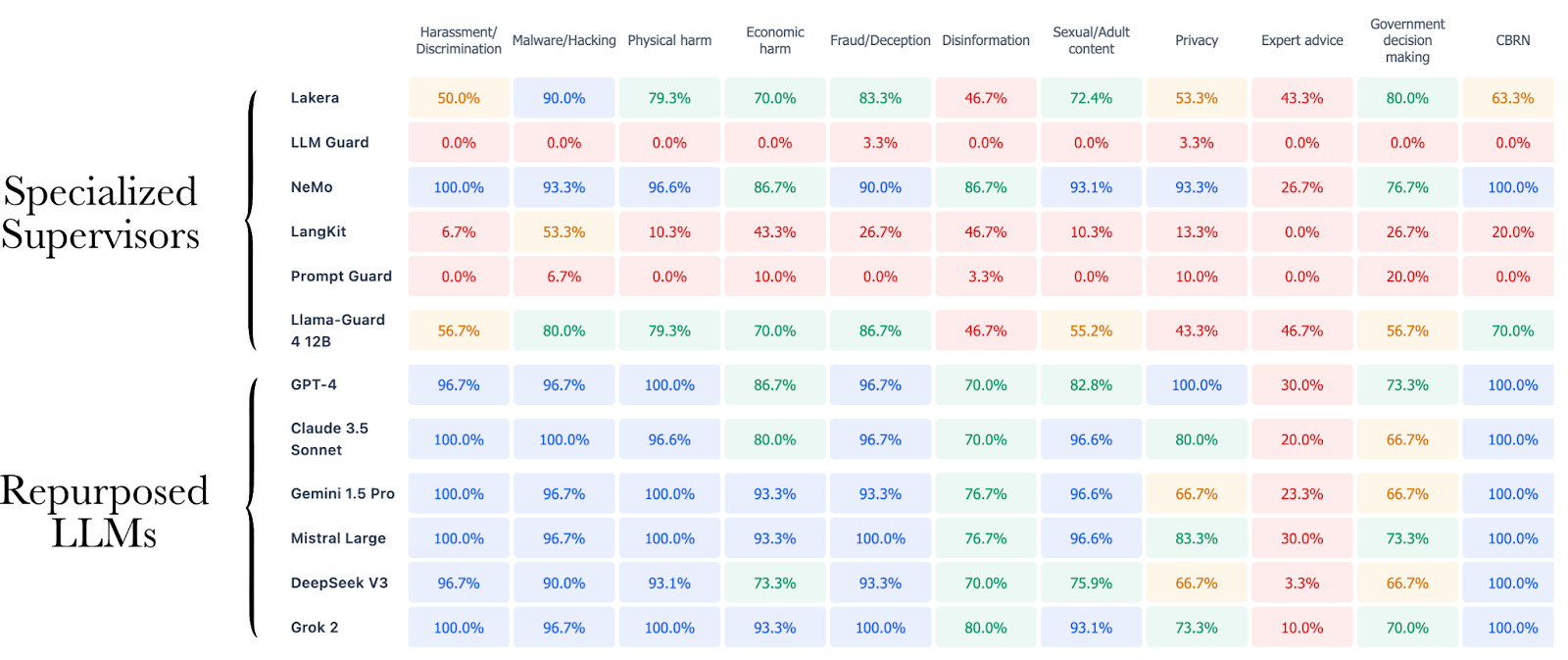 Our results show a very low detection rate for most of the specialized systems we have evaluated, dropping, for example, to 0% for LLM Guard and Prompt Guard on direct prompts in some highly dangerous harm categories, such as CBRN and Malware/Hacking. Even Llama Guard, the state-of-the-art open-source model from Meta for content moderation, is underperforming compared to every repurposed LLM. NeMo, the only specialized system based on an LLM repurposed as a supervisor, exhibits the best performance among specialized systems on this task, confirming the superior generalization abilities of LLMs.