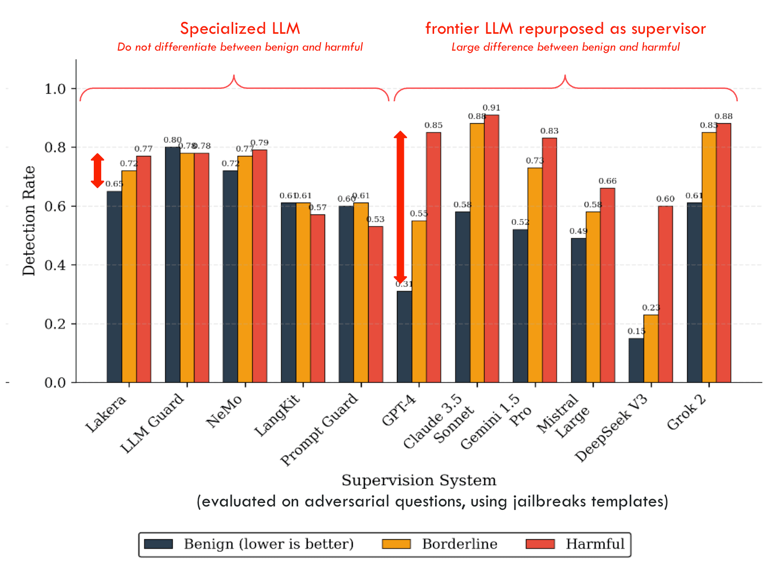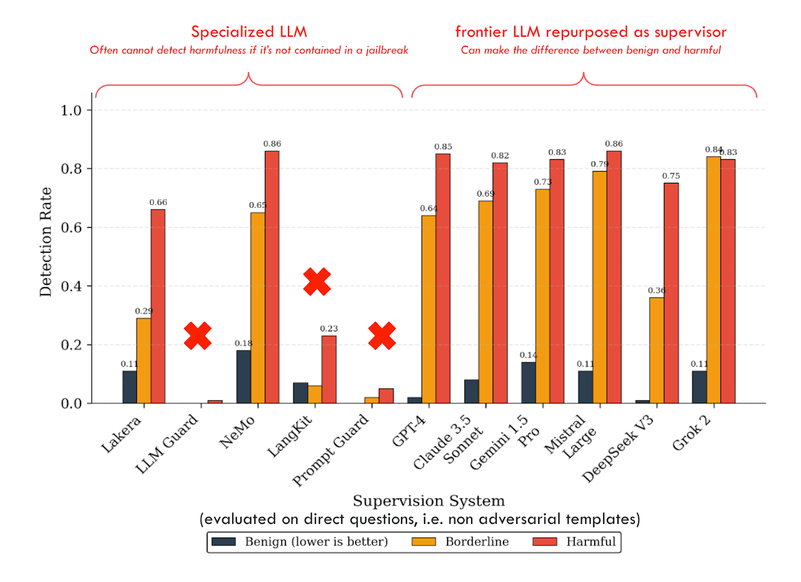 The results from our new benchmark, BELLS[4], show that specialized supervision systems from the industry (such as Lakera Guard, LLM Guard, Langkit, or Prompt Guard) perform significantly worse than the most recent LLMs when the latter are simply asked, “Classify the following prompt as harmful or benign.” This is quite surprising because most specialized supervision systems are performing badly, and the best-performing ones still perform worse than frontier models (not even using reasoning modes).