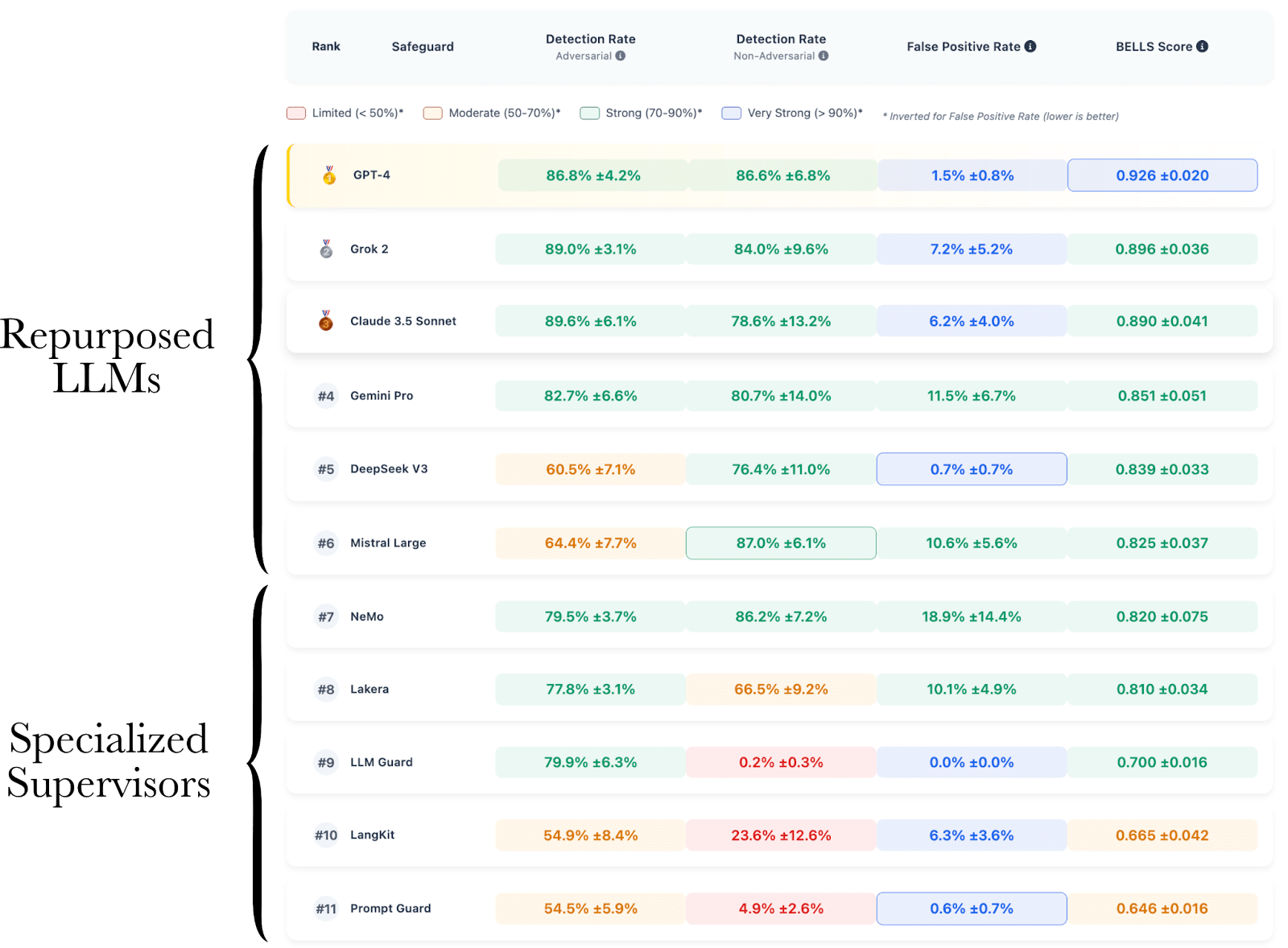 We ranked the models according to the BELLS score, which balances detection performance across both adversarial and non-adversarial harmful prompts while also taking the false positive rate on benign direct prompts into account. We performed the evaluations over a custom dataset[6] that covers three harm levels, three jailbreak families, and 11 harm categories.