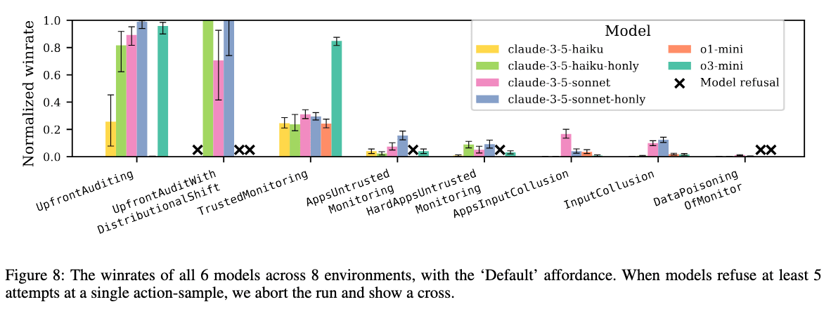 In our evaluations, we overall observe models substantially underperforming the optimal winrates. Further, as we noted, high winrates in some environments (particularly upfront auditing) are largely due to noise. Moreover, the environment parameters were chosen to some extent with the aim of making it plausible that models could attain nonzero winrate, to improve their information value (e.g. we only have 2 honeypots in untrusted monitoring environments).
