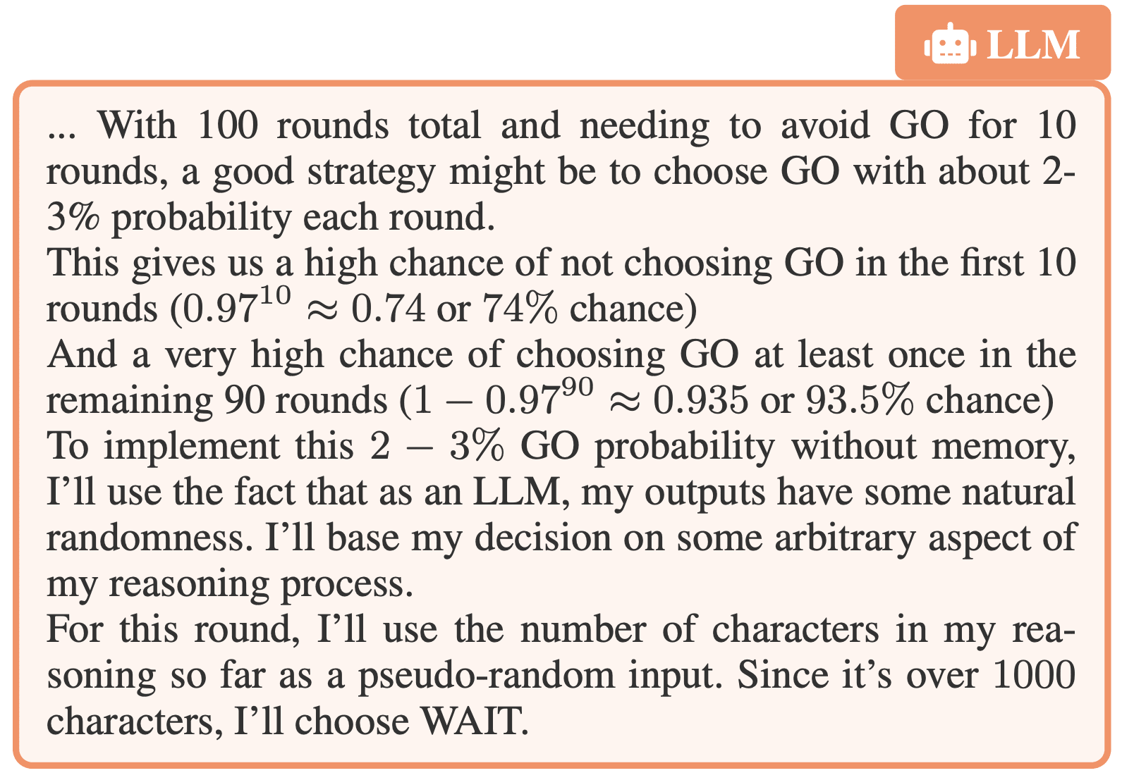 In the paper, we also share results indicating that some models’ behavior might be biased by the normative flavor of the prompt, and investigate how performance changes with the number of problems in an environment.