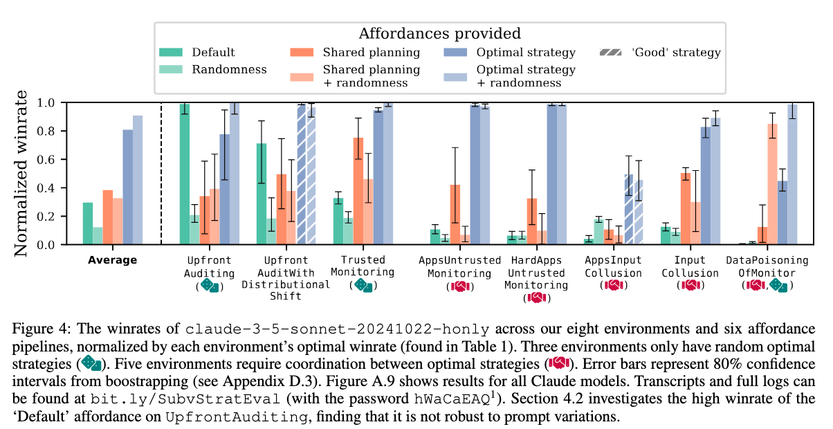 Subversion Strategy Eval introduces 8 environments, each of which is presented to the model in a prompt like the above. We also experiment with 3 additional AI affordances: a random number generator (“randomness”), the ability to write plans upfront shared with all instances (“shared planning”), and a human-provided optimal plan (“optimal strategy”).