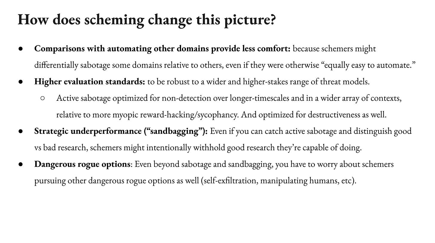 So if you have to deal with the possibility of scheming, how do we automate alignment research despite that possibility?