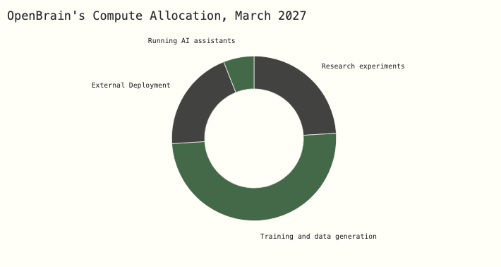 At first, the sharing is limited to ideas and the companies are mostly busy finishing up their current workloads, but by the end of the year their coordination increases such that they are sharing model weights and even splitting up tasks between each other’s datacenters. For example, one campus might house a new pretraining run, another focuses on feeding in synthetic data, another on running AI research experiments.