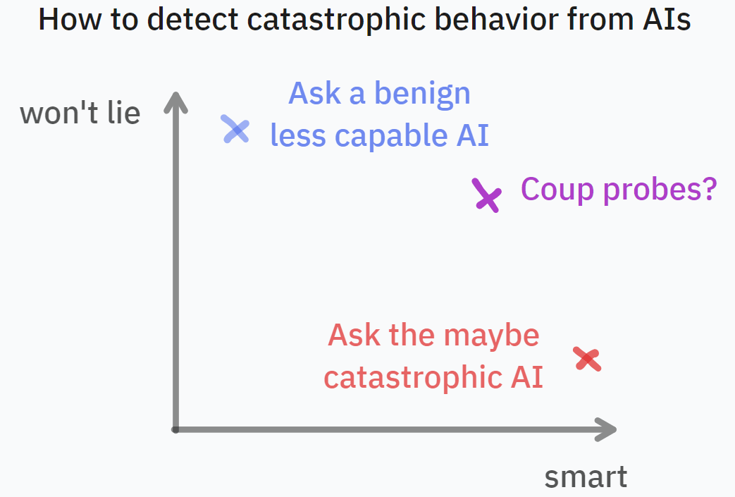 Here’s a simple safety intervention: train a probe on your AI to tell you whether it’s currently trying to do a catastrophic action. We call these coup probes.