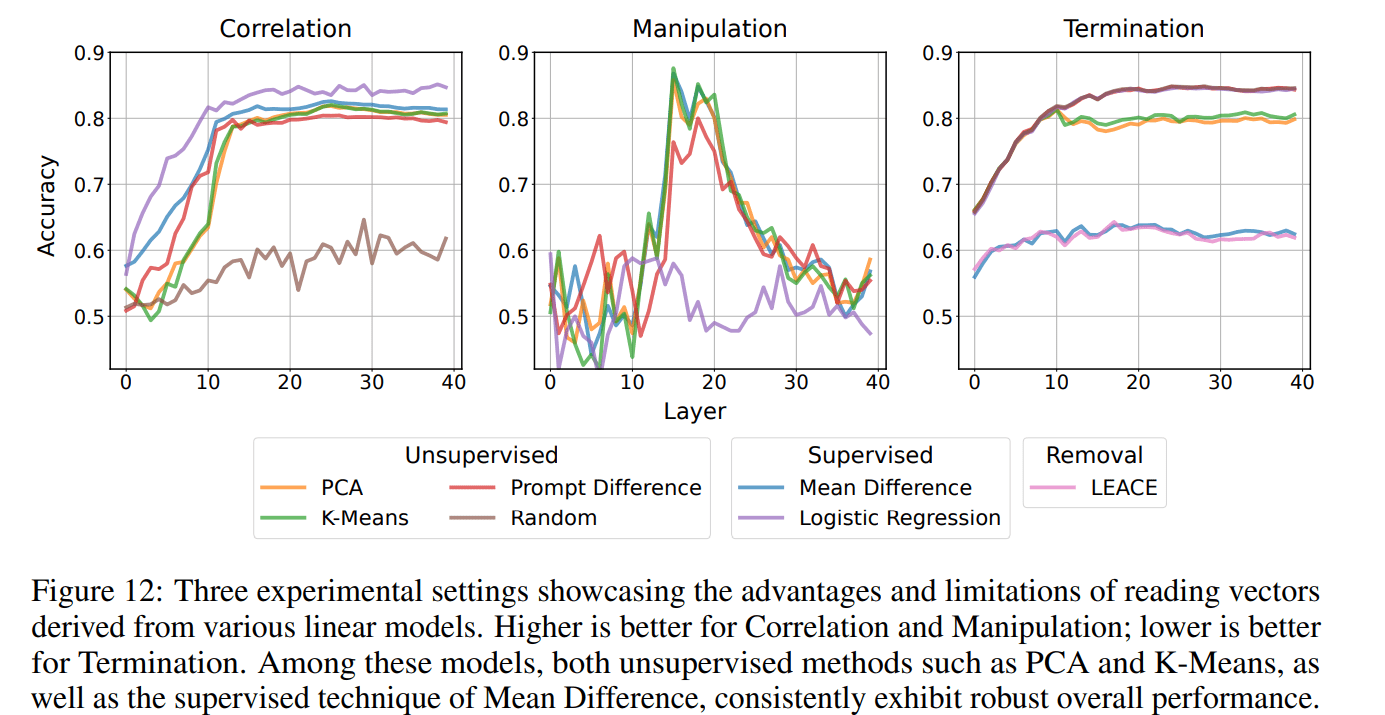 “Yea I think it's fair to say probes is a technique under rep reading which is under RepE (https://www.ai-transparency.org/). Though I did want to mention, in many settings, LAT is performing unsupervised learning with PCA and does not use any labels. And we find regular linear probing often does not generalize well and is ineffective for (causal) model control (e.g., details in section 5). So equating LAT to regular probing might be an oversimplification. How to best elicit the desired neural activity patterns requires careful design of 1) the experimental task and 2) locations to read the neural activity, which contribute to the success of LAT over regular probing (section 3.1.1).