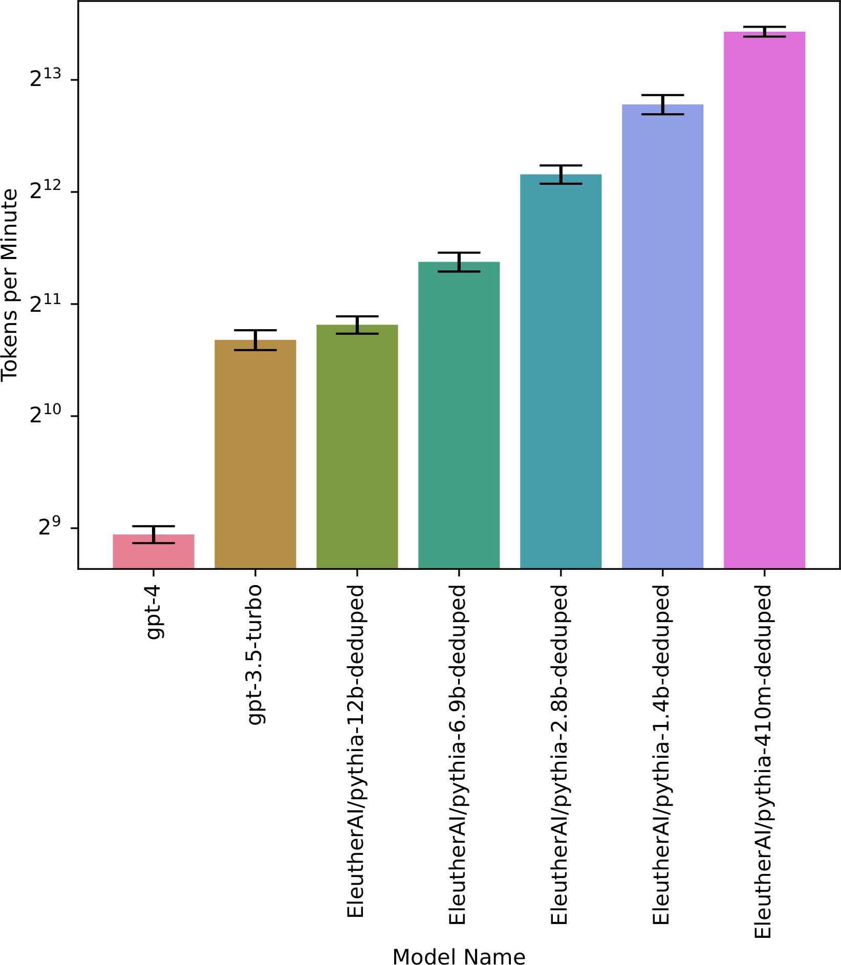 Next, let’s consider current models. We queried gpt-3.5-turbo and gpt-4, as well as several open source models from EleutherAI, to benchmark their inference speed. We did this by querying the models to count from 1 to n, where n ranged from 100 to 1900 inclusive in increments of 100. Since numbers contain more than one token, we cut the model off when it reached n tokens generated, and measured the time elapsed. We then ran a linear regression with a bias term to account for latency in order to estimate the asymptotic number of tokens per second.