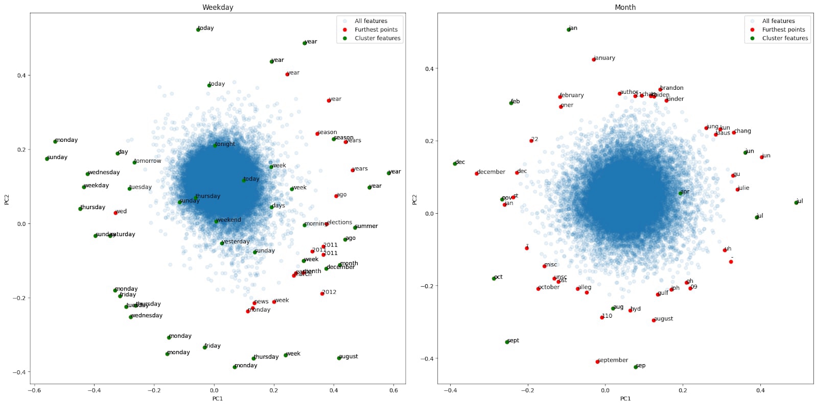 Other clusters have more or less interpretable principal components, which are displayed below in Figure 10. In these plots, the green points represent cluster features, the red points are points not in the cluster that are furthest from the mean (i.e. how we identified year related features before). These features are labeled with their max activating token.