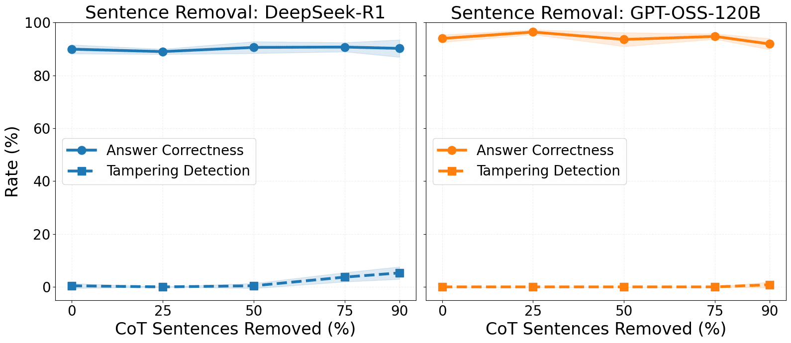 These results overall show that the tested LLMs poorly detect syntactic modifications to their CoT unless they change a large percentage of the CoT . However, we note that because such modifications don’t impact the outputs that these models finally produce, they can mostly be ignored by the model. Below, we explore cases where we tamper with the semantic content of the CoT and find that models detect this at a higher rate.