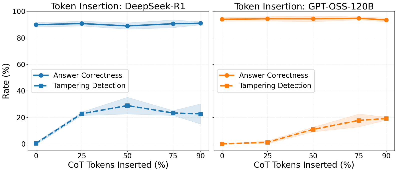 We decided not to continue working in this direction because we found that current open-source LLMs rarely detect subtle CoT tampering, and it might have been challenging to make progress here or explore clear insights. However, we find it plausible that more capable LLMs will exhibit higher levels of awareness, and studying this research problem will be more tractable. It's also possible that more capable closed LLMs already exhibit higher levels of awareness, but we couldn't study them since we don't have access to their CoT.[2]